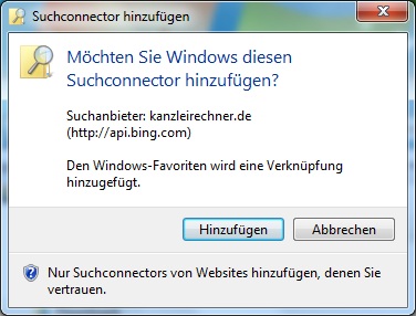 Das neue Betriebssystem Windows 7 von Microsoft wartet mit einigen Neuerungen auf. Darunter eine Funktion, mit der sich externe Quellen für eine Suche direkt in den Windows Explorer integrieren lassen. Die Integration beruht auf dem "OpenSearch" Standard und setzt einen entsprechenden "Connector" voraus, der inzwischen für viele Such-Quellen erhältlich ist. Im Download-Bereich der kanzleirechner.de Webseiten wird nun ein solcher Connector für die Suche in www.kanzleirechner.de (über die Microsoft-Suchmaschine Bing) mit dem Windows 7 Explorer bereitgestellt. |